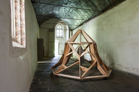 Le rapport entre l'extérieur et l'intérieur s'installe immédiatement à travers la sémi-opacité de la construction. La psychologie de l'objet s'affirme grâce aux motifs produits par le matériau qui en devient la peau et qui se retend en accueillant le noyau. Ce dernier gravite à l’intérieur de la structure tel un atome qui se maintient par la ronde des électrons. L’axiome soulevé par les deux œuvres et les questions d’échelle qu’elle évoque enveloppe alors la chapelle elle-même, et avec elle l’espace entier, tant physique que mental. Ainsi de l’échelle du corps nous passons graduellement à l’échelle de l’espace. Par principe d’emboîtement, le noyau au dessin cruciforme est à la fois un départ et une fin – il se trouve dans la chair de bois comme la capsule se trouve dans la fusée, comme la cloche se trouve dans la chapelle; le principe étant réversible, on en revient à l’atome.